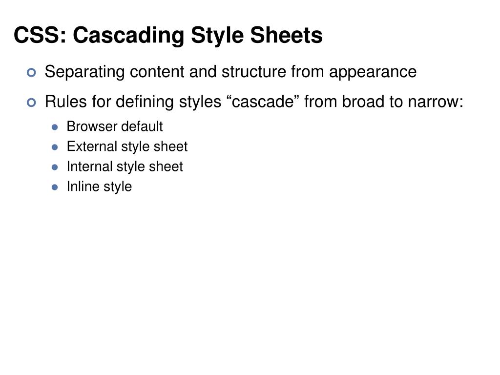 CSS: Cascading Style Sheets • Separating content and structure from appearance • Rules for defining styles “cascade” from broad to narrow: • Browser default • External style sheet • Internal style sheet • Inline style