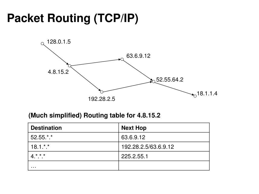 Packet Routing (TCP/IP) 128.0.1.5 63.6.9.12 4.8.15.2 52.55.64.2 18.1.1.4 192.28.2.5 (Much simplified) Routing table for 4.8.15.2
