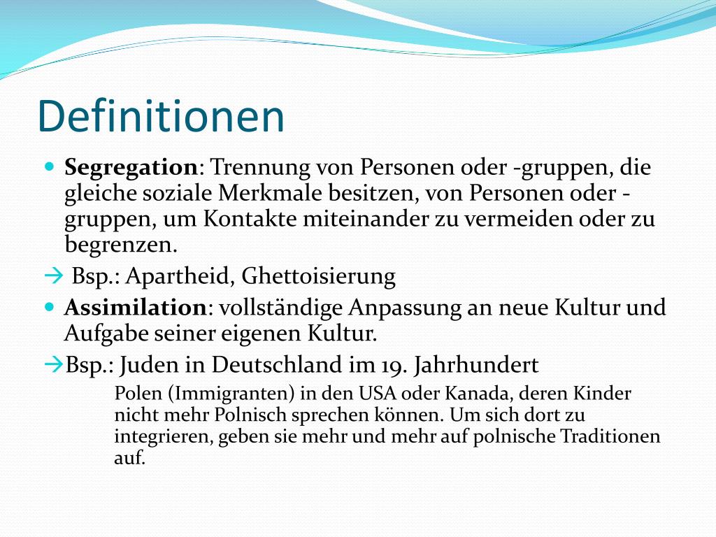 Definitionen • Segregation: Trennung von Personen oder -gruppen, die gleiche soziale Merkmale besitzen, von Personen oder -gruppen, um Kontakte miteinander zu vermeiden oder zu begrenzen. • Bsp.: Apartheid, Ghettoisierung • Assimilation: vollständige Anpassung an neue Kultur und Aufgabe seiner eigenen Kultur. • Bsp.: Juden in Deutschland im 19. Jahrhundert Polen (Immigranten) in den USA oder Kanada, deren Kinder nicht mehr Polnisch sprechen können. Um sich dort zu integrieren, geben sie mehr und mehr auf polnische Traditionen auf.