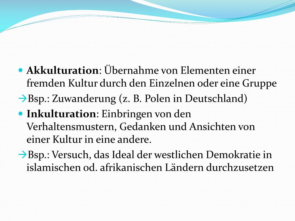 Akkulturation: Übernahme von Elementen einer fremden Kultur durch den Einzelnen oder eine Gruppe • Bsp.: Zuwanderung (z. B. Polen in Deutschland) • Inkulturation: Einbringen von den Verhaltensmustern, Gedanken und Ansichten von einer Kultur in eine andere. • Bsp.: Versuch, das Ideal der westlichen Demokratie in islamischen od. afrikanischen Ländern durchzusetzen