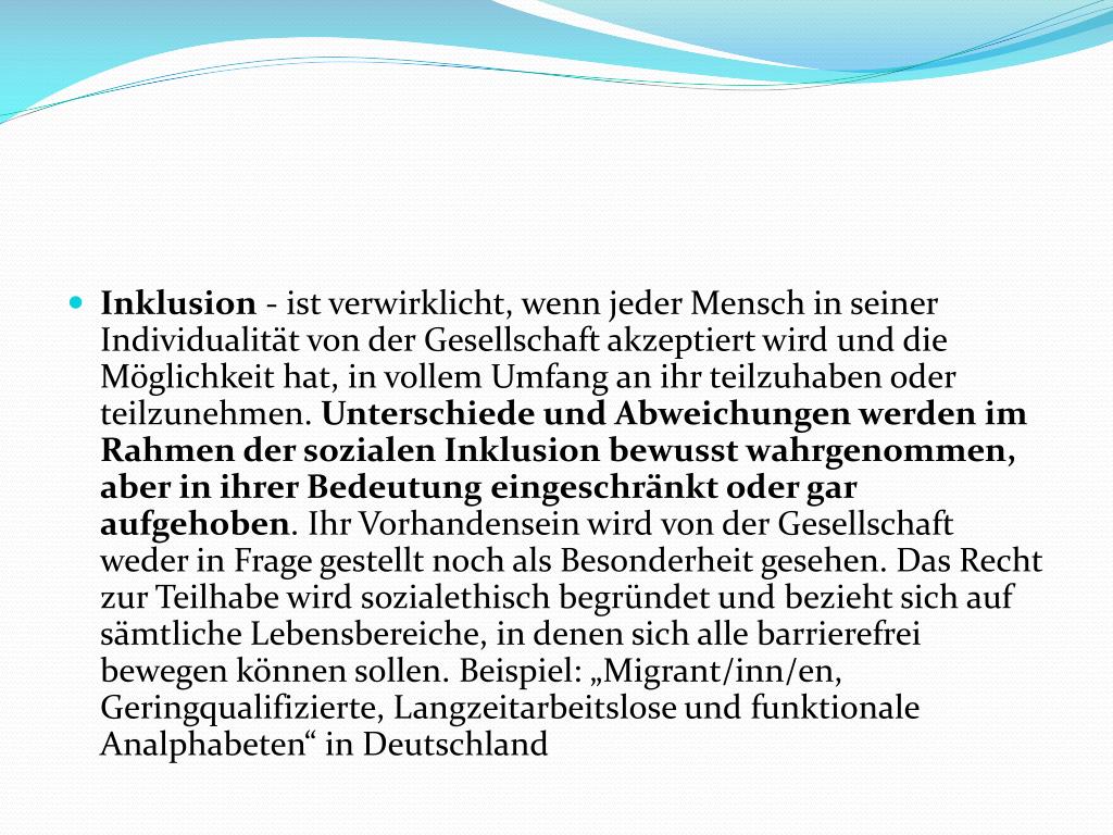Inklusion - ist verwirklicht, wenn jeder Mensch in seiner Individualität von der Gesellschaft akzeptiert wird und die Möglichkeit hat, in vollem Umfang an ihr teilzuhaben oder teilzunehmen. Unterschiede und Abweichungen werden im Rahmen der sozialen Inklusion bewusst wahrgenommen, aber in ihrer Bedeutung eingeschränkt oder gar aufgehoben. Ihr Vorhandensein wird von der Gesellschaft weder in Frage gestellt noch als Besonderheit gesehen. Das Recht zur Teilhabe wird sozialethisch begründet und bezieht sich auf sämtliche Lebensbereiche, in denen sich alle barrierefrei bewegen können sollen. Beispiel: „Migrant/inn/en, Geringqualifizierte, Langzeitarbeitslose und funktionale Analphabeten“ in Deutschland