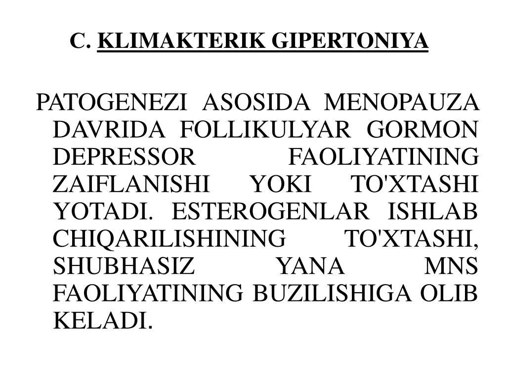 С. KLIMAKTERIK GIPERTONIYA PATOGENEZI ASOSIDA MENOPAUZA DAVRIDA FOLLIKULYAR GORMON DEPRESSOR FAOLIYATINING ZAIFLANISHI YOKI TO'XTASHI YOTADI. ESTEROGENLAR ISHLAB CHIQARILISHINING TO'XTASHI, SHUBHASIZ YANA MNS FAOLIYATINING BUZILISHIGA OLIB KELADI.