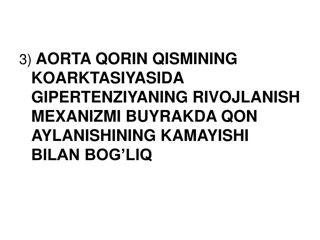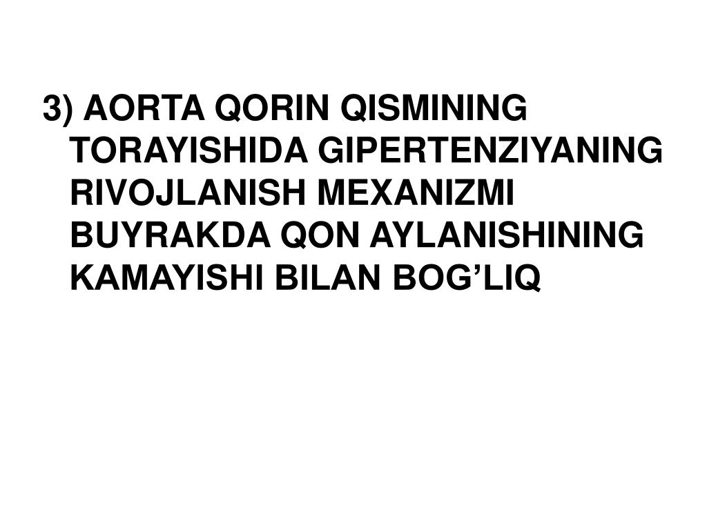 3)AORTA QORIN QISMINING TORAYISHIDA GIPERTENZIYANING RIVOJLANISH MEXANIZMI BUYRAKDA QON AYLANISHINING KAMAYISHI BILAN BOG’LIQ