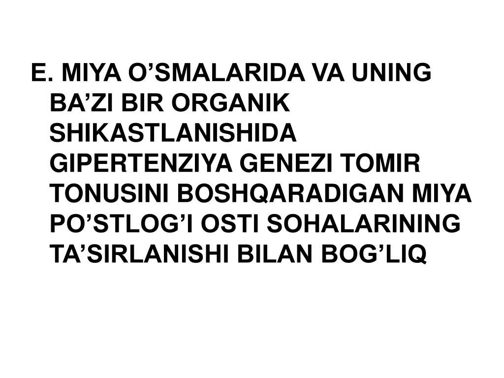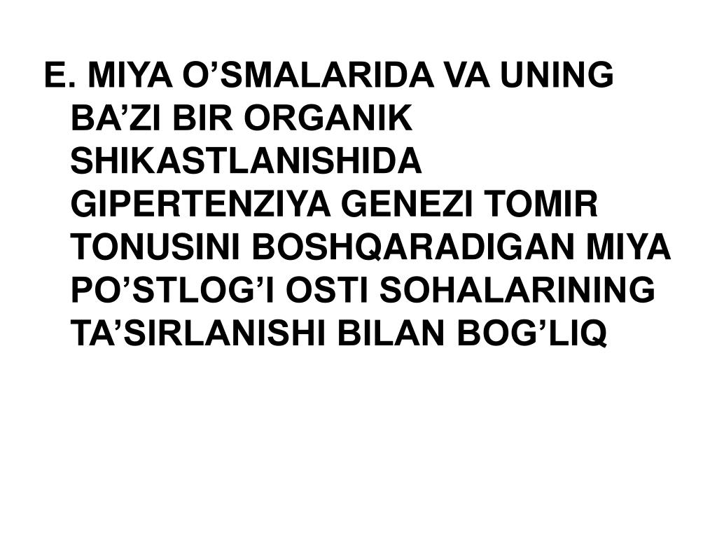 E. MIYA O’SMALARIDA VA UNING BA’ZI BIR ORGANIK SHIKASTLANISHIDA GIPERTENZIYA GENEZI TOMIR TONUSINI BOSHQARADIGAN MIYA PO’STLOG’I OSTI SOHALARINING TA’SIRLANISHI BILAN BOG’LIQ