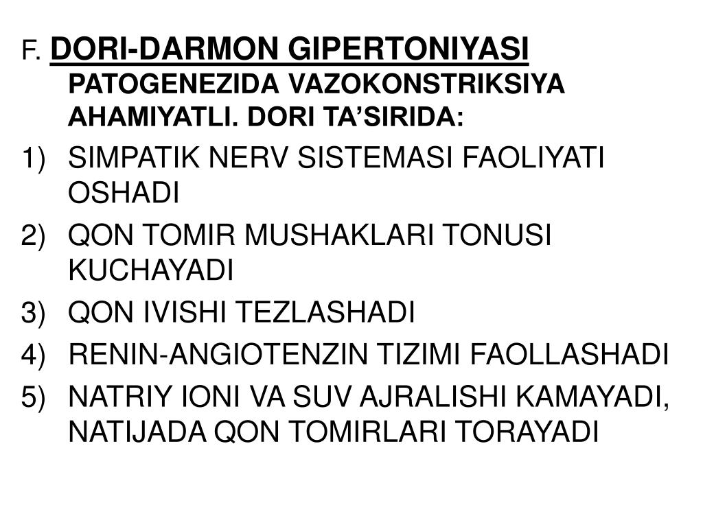F. DORI-DARMON GIPERTONIYASI PATOGENEZIDAVAZOKONSTRIKSIYA AHAMIYATLI. DORI TA’SIRIDA: • SIMPATIK NERV SISTEMASI FAOLIYATI OSHADI • QON TOMIR MUSHAKLARI TONUSI KUCHAYADI • QON IVISHI TEZLASHADI • RENIN-ANGIOTENZIN TIZIMI FAOLLASHADI • NATRIY IONI VA SUV AJRALISHI KAMAYADI, NATIJADA QON TOMIRLARI TORAYADI