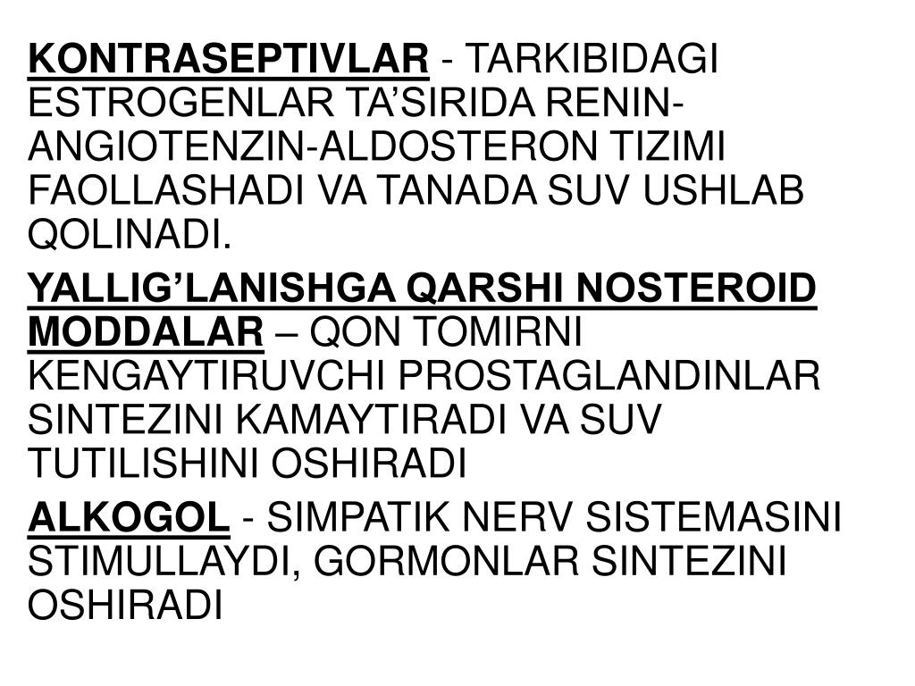 KONTRASEPTIVLAR - TARKIBIDAGI ESTROGENLAR TA’SIRIDA RENIN-ANGIOTENZIN-ALDOSTERON TIZIMI FAOLLASHADI VA TANADA SUV USHLAB QOLINADI. YALLIG’LANISHGA QARSHI NOSTEROID MODDALAR – QON TOMIRNI KENGAYTIRUVCHI PROSTAGLANDINLAR SINTEZINI KAMAYTIRADI VA SUV TUTILISHINI OSHIRADI ALKOGOL - SIMPATIK NERV SISTEMASINI STIMULLAYDI, GORMONLAR SINTEZINI OSHIRADI