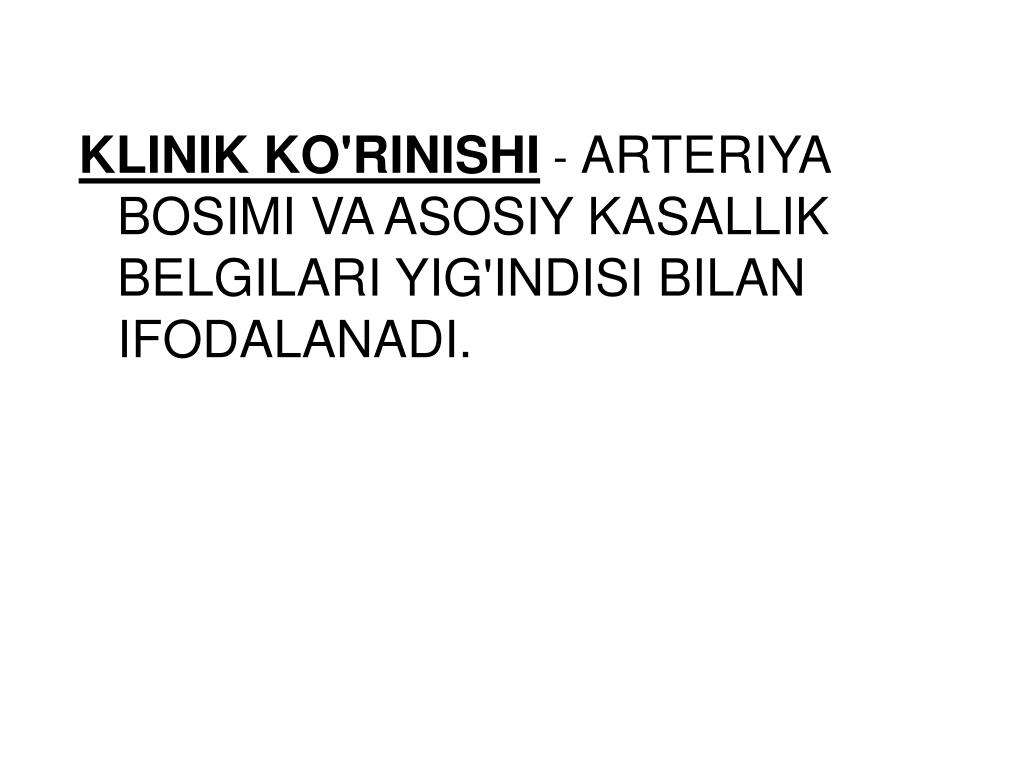KLINIK KO'RINISHI - ARTERIYA BOSIMI VA ASOSIY KASALLIK BELGILARI YIG'INDISI BILAN IFODALANADI.