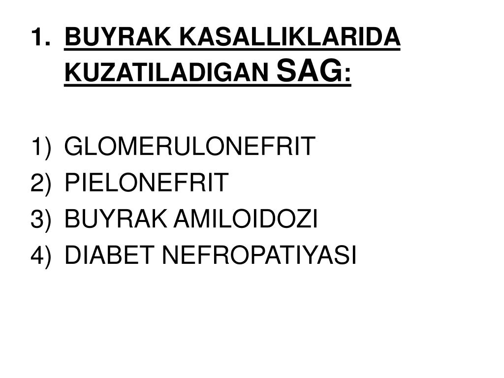 BUYRAK KASALLIKLARIDA KUZATILADIGAN SAG: • GLOMERULONEFRIT • PIELONEFRIT • BUYRAK AMILOIDOZI • DIABET NEFROPATIYASI