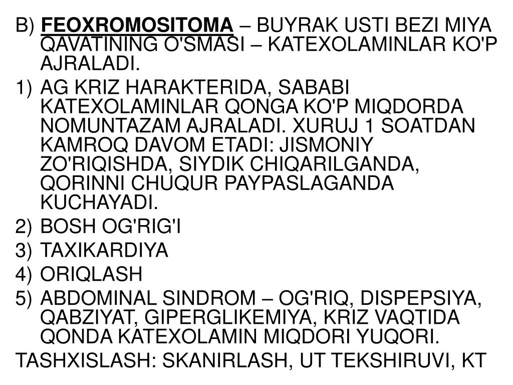 B) FEOXROMOSITOMA – BUYRAK USTI BEZI MIYA QAVATINING O'SMASI – KATEXOLAMINLAR KO'P AJRALADI. • AG KRIZ HARAKTERIDA, SABABI KATEXOLAMINLAR QONGA KO'P MIQDORDA NOMUNTAZAM AJRALADI. XURUJ 1 SOATDAN KAMROQ DAVOM ETADI: JISMONIY ZO'RIQISHDA, SIYDIK CHIQARILGANDA, QORINNI CHUQUR PAYPASLAGANDA KUCHAYADI. • BOSH OG'RIG'I • TAXIKARDIYA • ORIQLASH • ABDOMINAL SINDROM – OG'RIQ, DISPEPSIYA, QABZIYAT, GIPERGLIKEMIYA, KRIZ VAQTIDA QONDA KATEXOLAMIN MIQDORI YUQORI. TASHXISLASH: SKANIRLASH, UT TEKSHIRUVI, KT