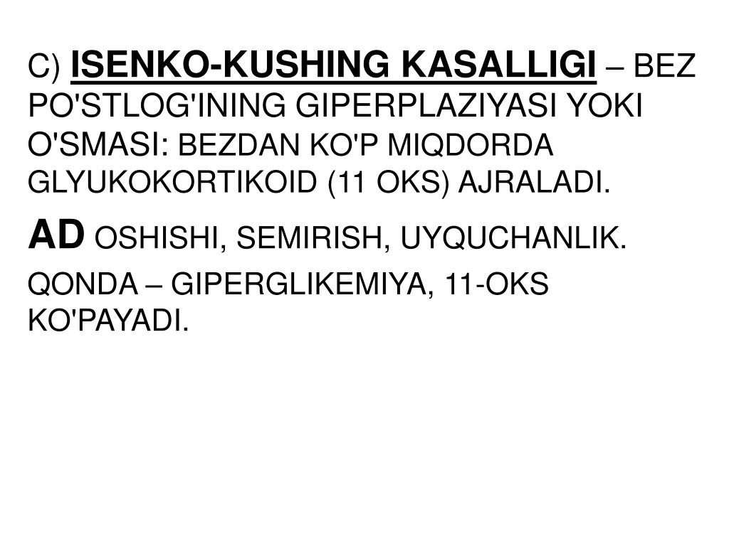 C) ISENKO-KUSHING KASALLIGI – BEZ PO'STLOG'INING GIPERPLAZIYASI YOKI O'SMASI: BEZDAN KO'P MIQDORDA GLYUKOKORTIKOID (11 OKS) AJRALADI. ADOSHISHI, SEMIRISH, UYQUCHANLIK. QONDA – GIPERGLIKEMIYA, 11-OKS KO'PAYADI.