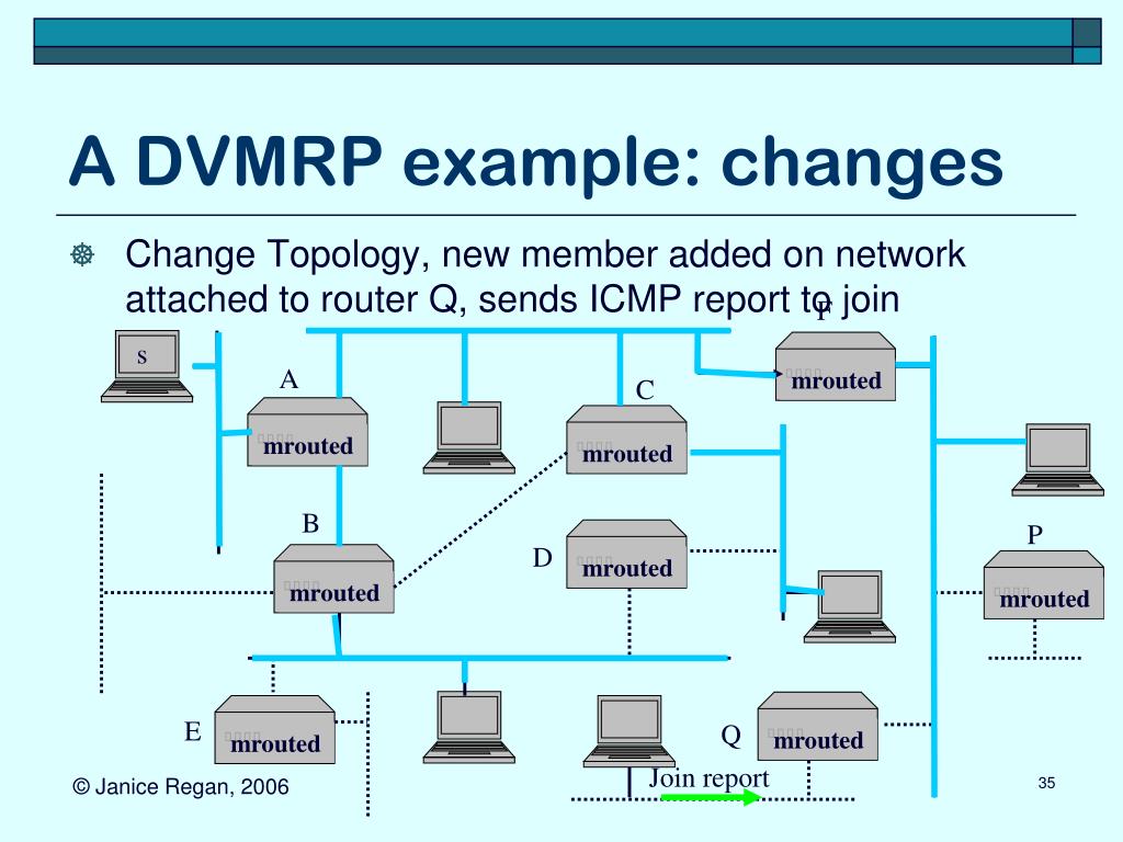 mrouted mrouted mrouted mrouted mrouted mrouted mrouted mrouted A DVMRP example: changes • Change Topology, new member added on network attached to router Q, sends ICMP report to join F s A C B P D A E Q A