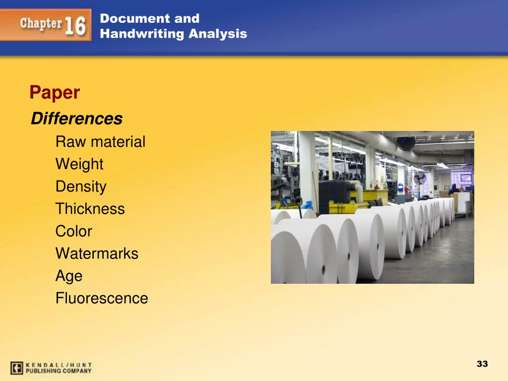 Differences Raw material Weight Density Thickness Color Watermarks Age Fluorescence Paper