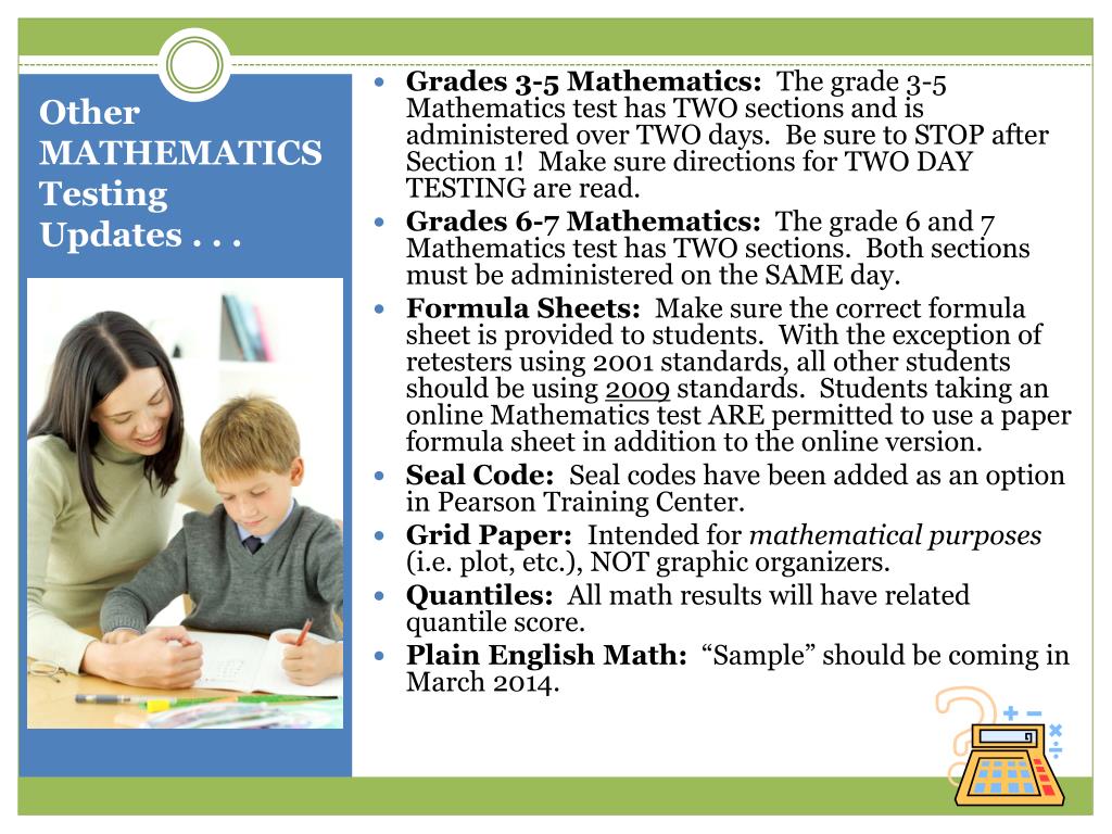 Grades 3-5 Mathematics: The grade 3-5 Mathematics test has TWO sections and is administered over TWO days. Be sure to STOP after Section 1! Make sure directions for TWO DAY TESTING are read. • Grades 6-7 Mathematics: The grade 6 and 7 Mathematics test has TWO sections. Both sections must be administered on the SAME day. • Formula Sheets: Make sure the correct formula sheet is provided to students. With the exception of retesters using 2001 standards, all other students should be using 2009 standards. Students taking an online Mathematics test ARE permitted to use a paper formula sheet in addition to the online version. • Seal Code: Seal codes have been added as an option in Pearson Training Center. • Grid Paper: Intended for mathematical purposes (i.e. plot, etc.), NOT graphic organizers. • Quantiles: All math results will have related quantile score. • Plain English Math: “Sample” should be coming in March 2014. Other MATHEMATICS Testing Updates . . .