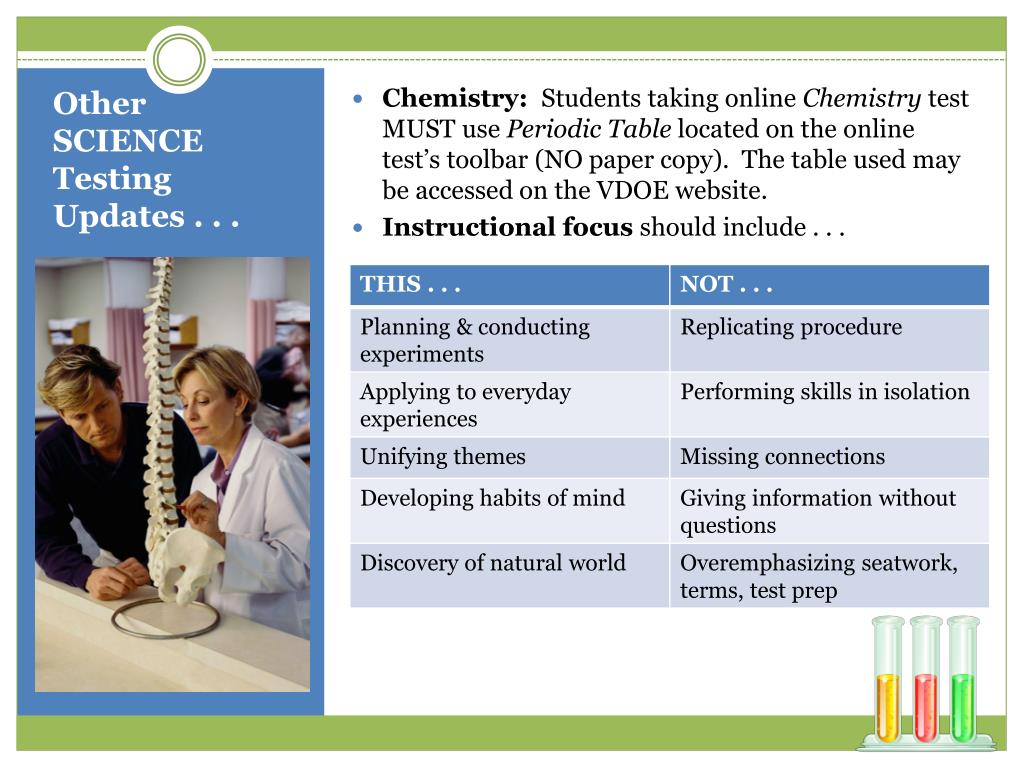 Chemistry: Students taking online Chemistry test MUST use Periodic Table located on the online test’s toolbar (NO paper copy). The table used may be accessed on the VDOE website. • Instructional focus should include . . . Other SCIENCE Testing Updates . . .
