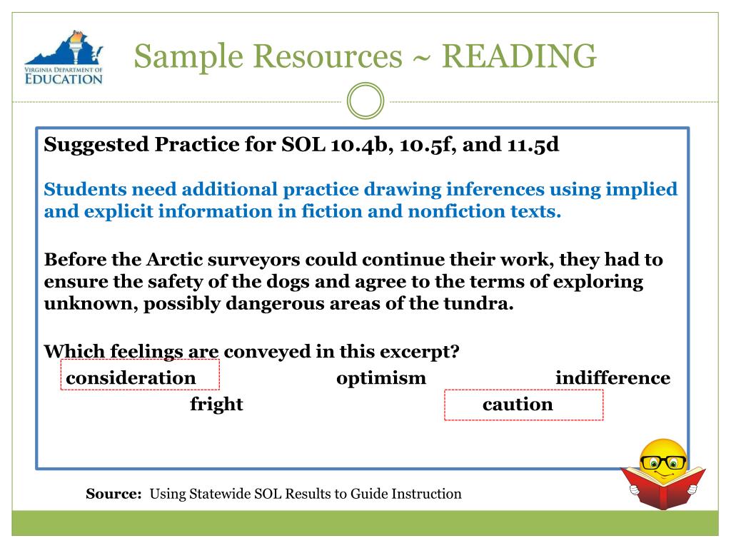 Sample Resources ~ READING Suggested Practice for SOL 10.4b, 10.5f, and 11.5d Students need additional practice drawing inferences using implied and explicit information in fiction and nonfiction texts. Before the Arctic surveyors could continue their work, they had to ensure the safety of the dogs and agree to the terms of exploring unknown, possibly dangerous areas of the tundra. Which feelings are conveyed in this excerpt? consideration optimism indifference fright caution Source: Using Statewide SOL Results to Guide Instruction