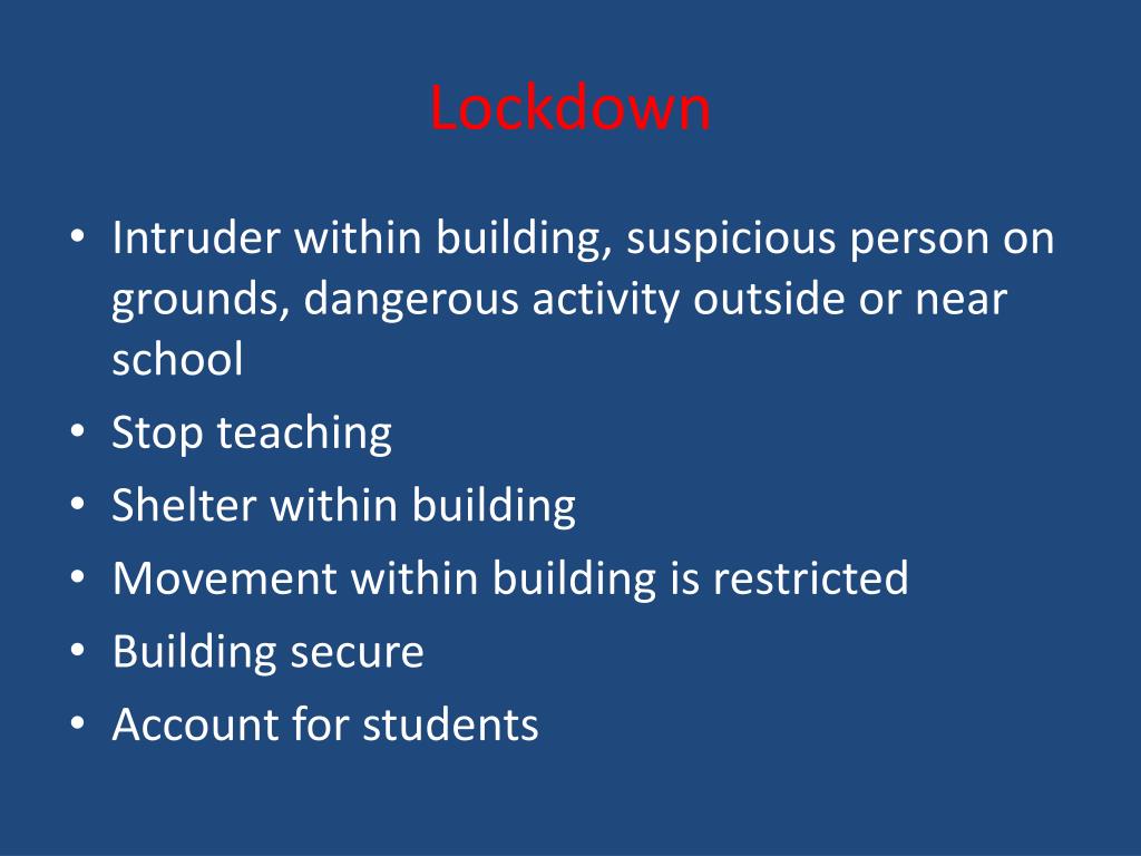 Lockdown • Intruder within building, suspicious person on grounds, dangerous activity outside or near school • Stop teaching • Shelter within building • Movement within building is restricted • Building secure • Account for students