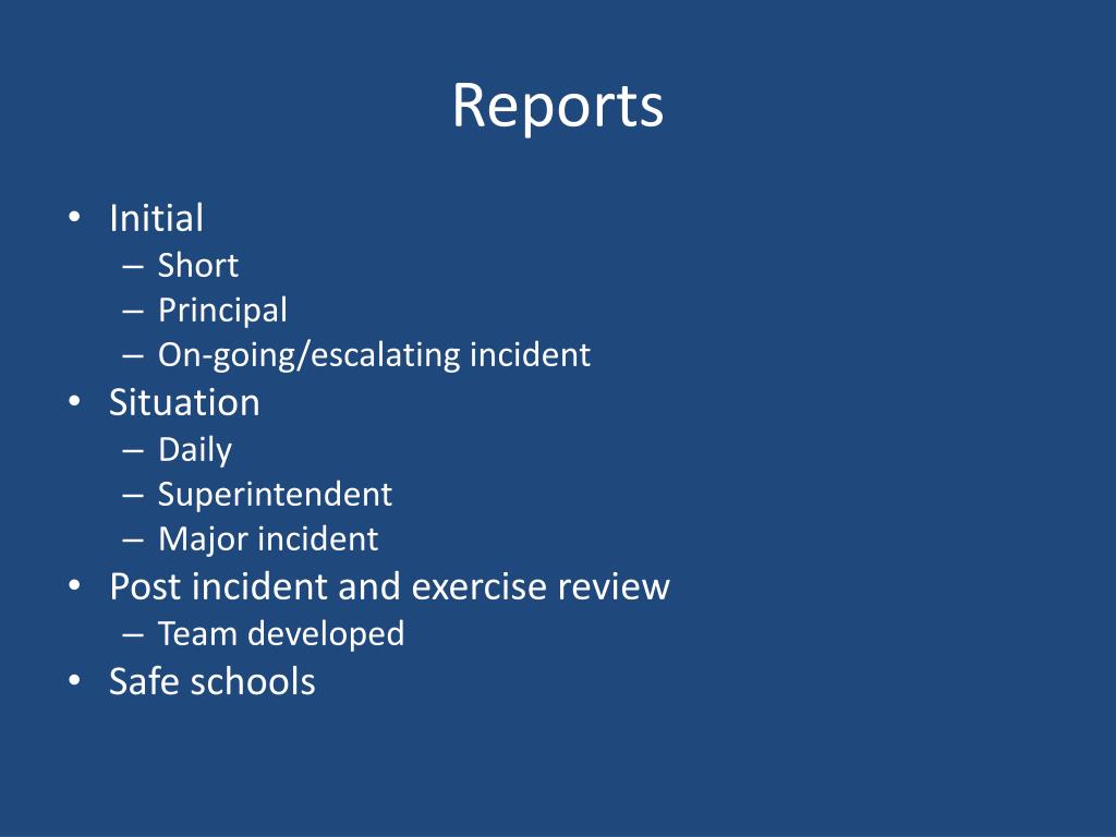 Reports • Initial • Short • Principal • On-going/escalating incident • Situation • Daily • Superintendent • Major incident • Post incident and exercise review • Team developed • Safe schools