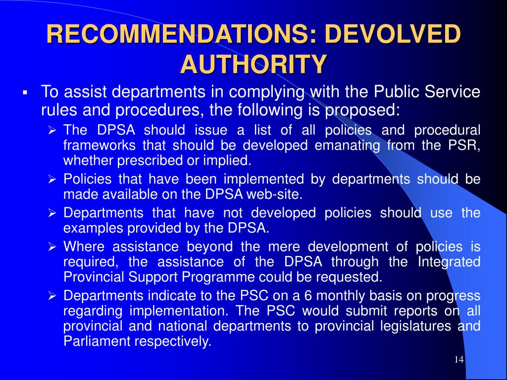 RECOMMENDATIONS: DEVOLVED AUTHORITY • To assist departments in complying with the Public Service rules and procedures, the following is proposed: • The DPSA should issue a list of all policies and procedural frameworks that should be developed emanating from the PSR, whether prescribed or implied. • Policies that have been implemented by departments should be made available on the DPSA web-site. • Departments that have not developed policies should use the examples provided by the DPSA. • Where assistance beyond the mere development of policies is required, the assistance of the DPSA through the Integrated Provincial Support Programme could be requested. • Departments indicate to the PSC on a 6 monthly basis on progress regarding implementation. The PSC would submit reports on all provincial and national departments to provincial legislatures and Parliament respectively.