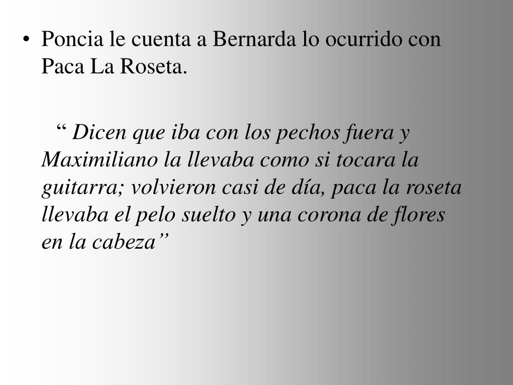 Poncia le cuenta a Bernarda lo ocurrido con Paca La Roseta. “ Dicen que iba con los pechos fuera y Maximiliano la llevaba como si tocara la guitarra; volvieron casi de día, paca la roseta llevaba el pelo suelto y una corona de flores en la cabeza”