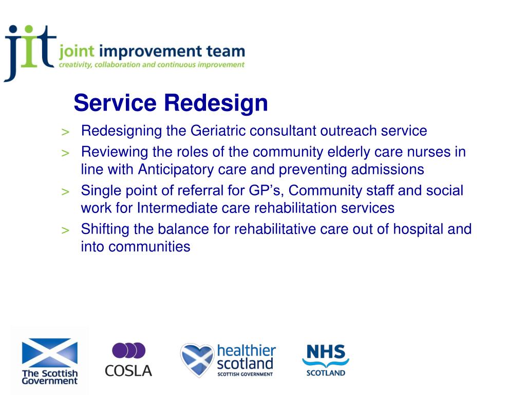 Redesigning the Geriatric consultant outreach service Reviewing the roles of the community elderly care nurses in line with Anticipatory care and preventing admissions Single point of referral for GP’s, Community staff and social work for Intermediate care rehabilitation services Shifting the balance for rehabilitative care out of hospital and into communities Service Redesign
