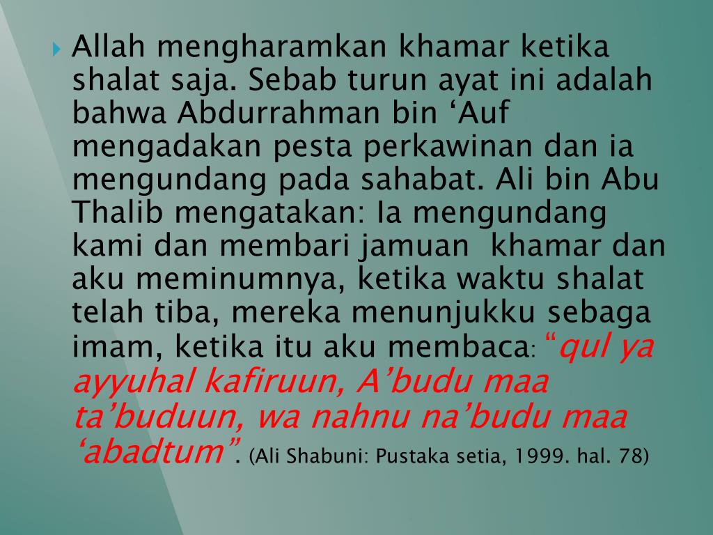 Allah mengharamkankhamarketikashalatsaja. Sebabturunayatiniadalahbahwa Abdurrahman bin ‘Auf mengadakanpestaperkawinandaniamengundangpadasahabat. Ali bin Abu Thalibmengatakan: Iamengundangkami danmembarijamuankhamardanakumeminumnya, ketikawaktushalattelahtiba, merekamenunjukkusebaga imam, ketikaituakumembaca: “qulyaayyuhalkafiruun, A’budumaata’buduun, wanahnuna’budumaa ‘abadtum”. (Ali Shabuni: Pustakasetia, 1999. hal. 78)