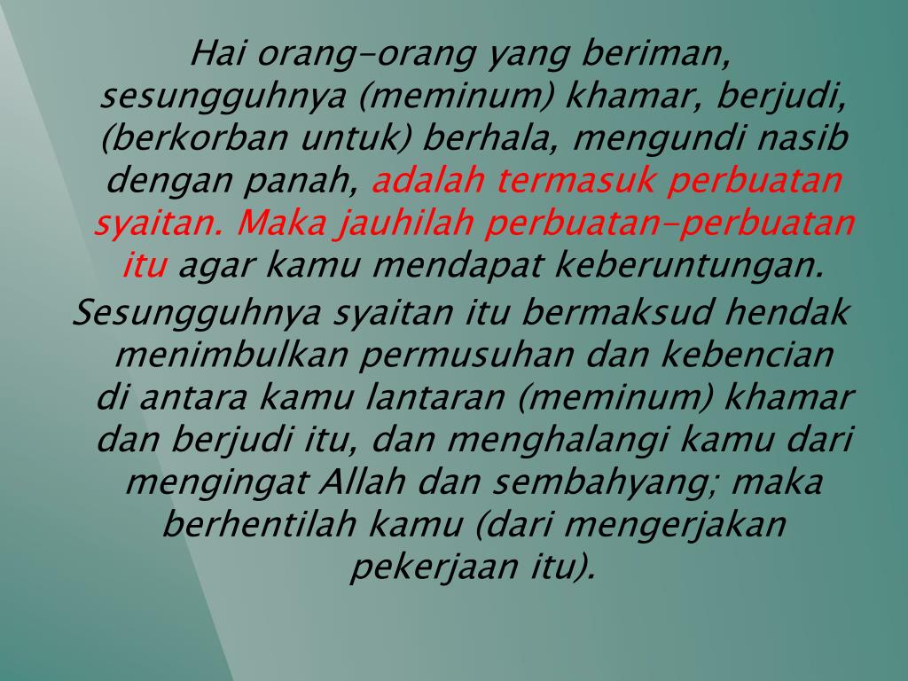 Haiorang-orang yang beriman, sesungguhnya (meminum) khamar, berjudi, (berkorbanuntuk) berhala, mengundinasibdenganpanah, adalahtermasukperbuatansyaitan. Makajauhilahperbuatan-perbuatanitu agar kamumendapatkeberuntungan. Sesungguhnyasyaitanitubermaksudhendakmenimbulkanpermusuhandankebenciandiantarakamulantaran (meminum) khamardanberjudiitu, danmenghalangikamudarimengingat Allah dansembahyang; makaberhentilahkamu (darimengerjakanpekerjaanitu).