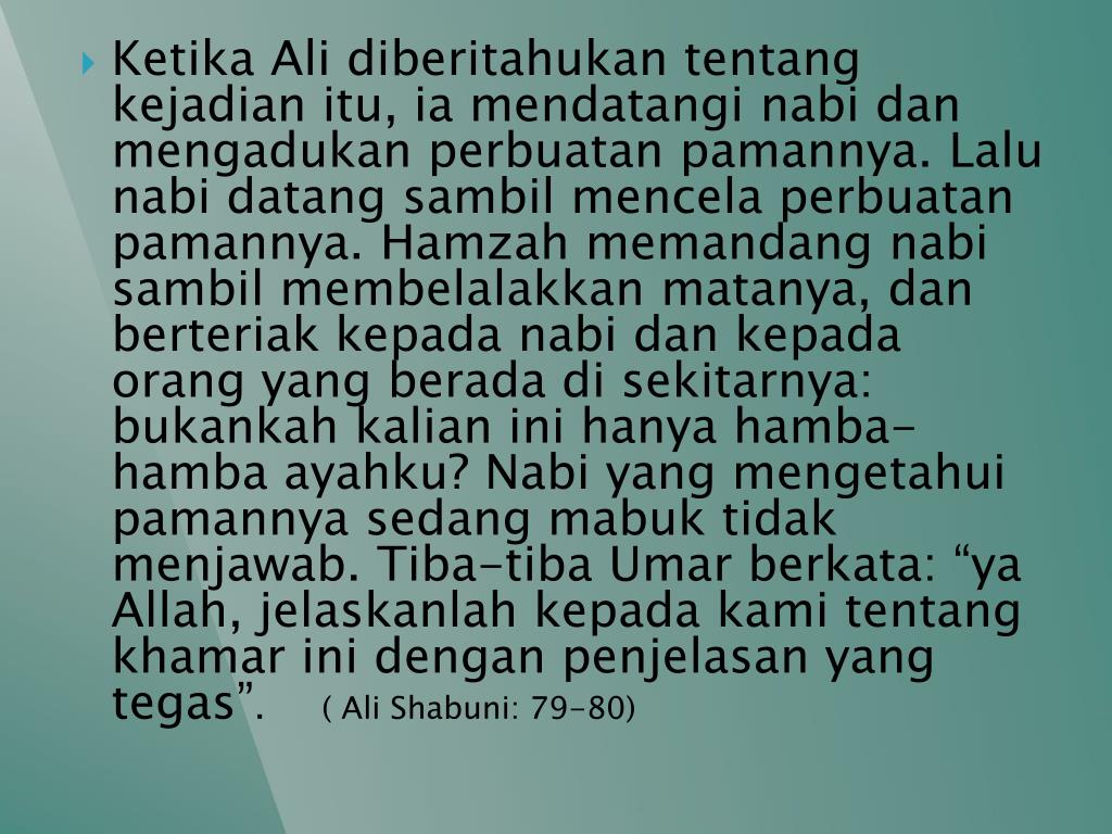 Ketika Ali diberitahukantentangkejadianitu, iamendatanginabidanmengadukanperbuatanpamannya. Lalunabidatangsambilmencelaperbuatanpamannya. Hamzahmemandangnabisambilmembelalakkanmatanya, danberteriakkepadanabidankepadaorang yang beradadisekitarnya: bukankah kalian inihanyahamba-hambaayahku? Nabi yang mengetahuipamannyasedangmabuktidakmenjawab. Tiba-tibaUmarberkata: “ya Allah, jelaskanlahkepadakamitentangkhamarinidenganpenjelasan yang tegas”. ( Ali Shabuni: 79-80)