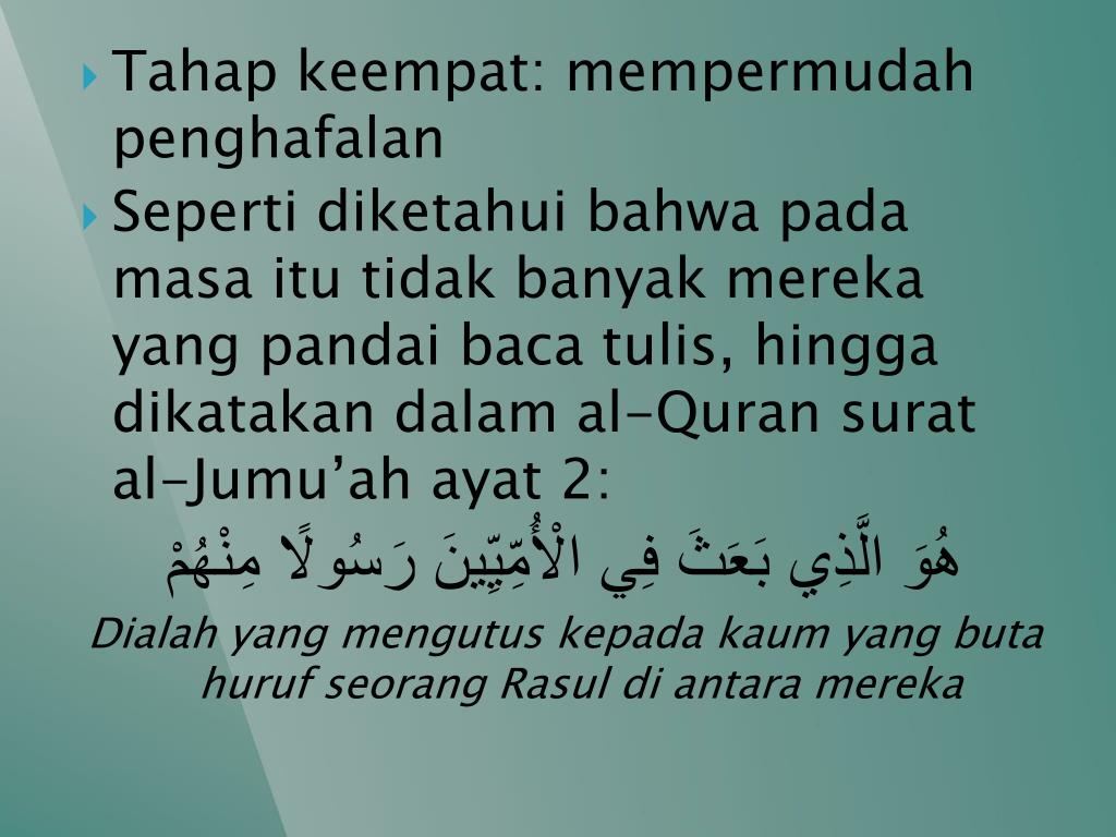 Tahapkeempat: mempermudahpenghafalan • Sepertidiketahuibahwapadamasaitutidakbanyakmereka yang pandaibacatulis, hinggadikatakandalam al-Quran surat al-Jumu’ahayat 2: هُوَ الَّذِي بَعَثَ فِي الْأُمِّيِّينَ رَسُولًا مِنْهُمْ Dialah yang mengutuskepadakaum yang butahurufseorangRasuldiantaramereka
