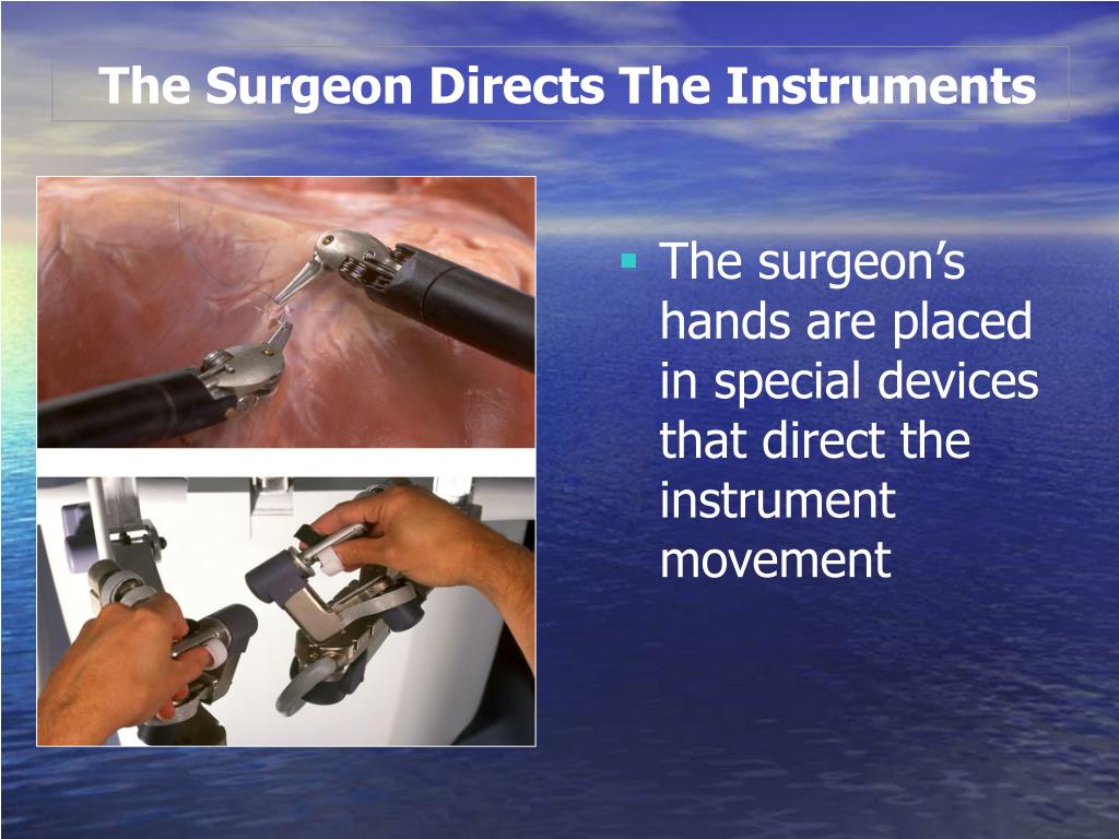The Surgeon Directs The Instruments • The surgeon’s hands are placed in special devices that direct the instrument movement