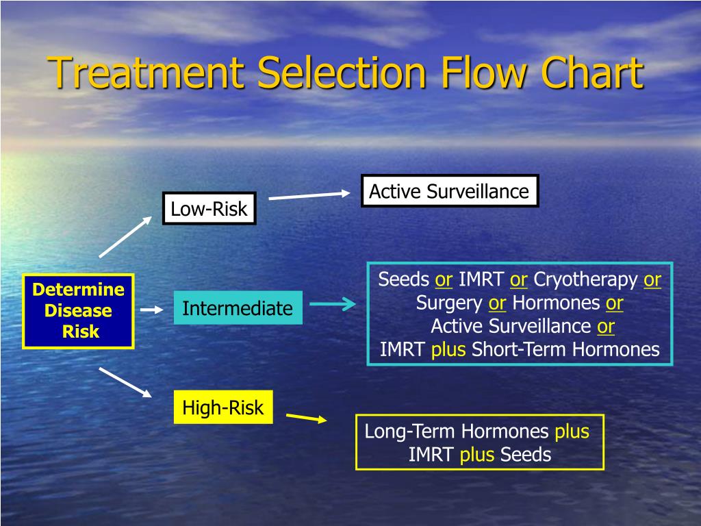 Treatment Selection Flow Chart Active Surveillance Low-Risk Seeds or IMRT or Cryotherapy or Surgery or Hormones or Active Surveillance or IMRT plus Short-Term Hormones Determine Disease Risk Intermediate High-Risk Long-Term Hormones plus IMRT plus Seeds
