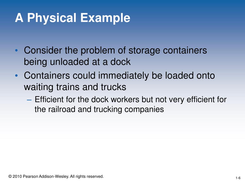 A Physical Example • Consider the problem of storage containers being unloaded at a dock • Containers could immediately be loaded onto waiting trains and trucks • Efficient for the dock workers but not very efficient for the railroad and trucking companies