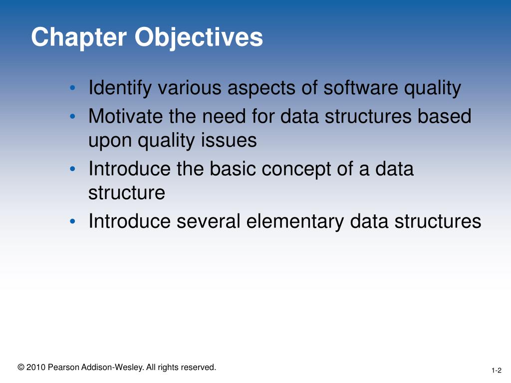 Chapter Objectives • Identify various aspects of software quality • Motivate the need for data structures based upon quality issues • Introduce the basic concept of a data structure • Introduce several elementary data structures