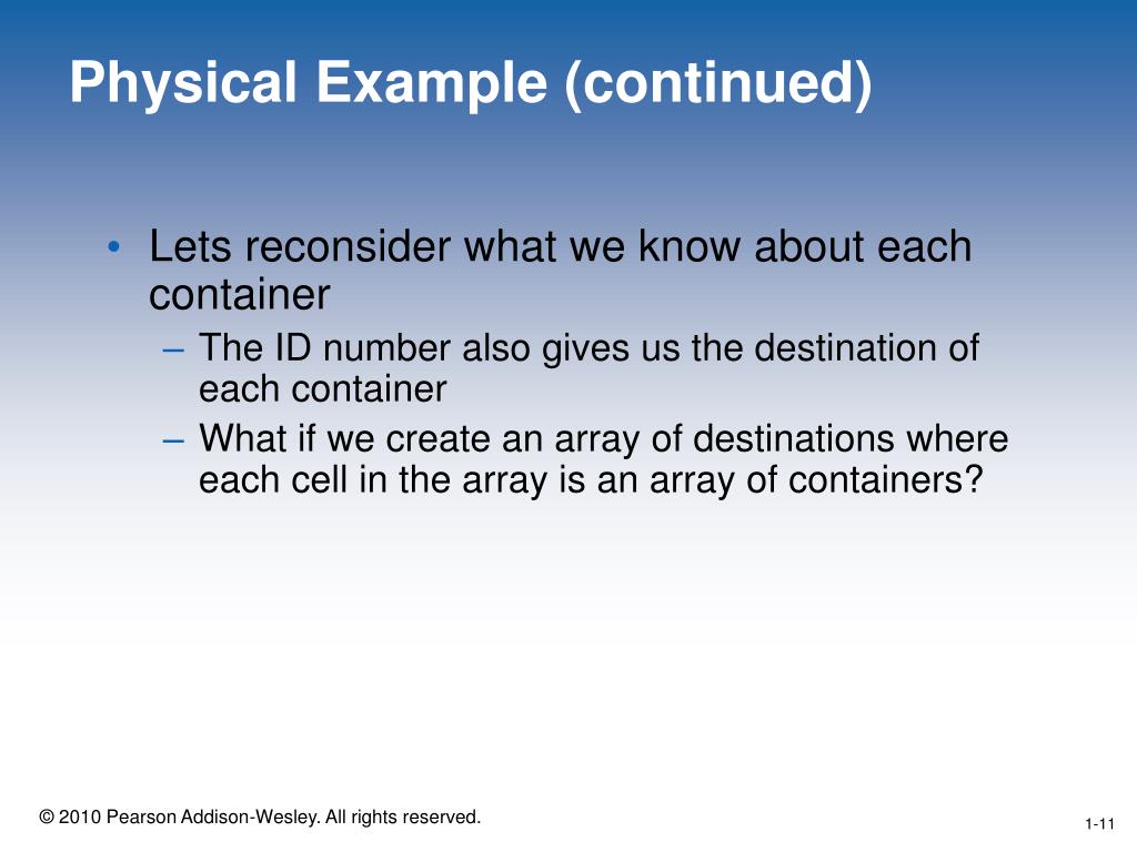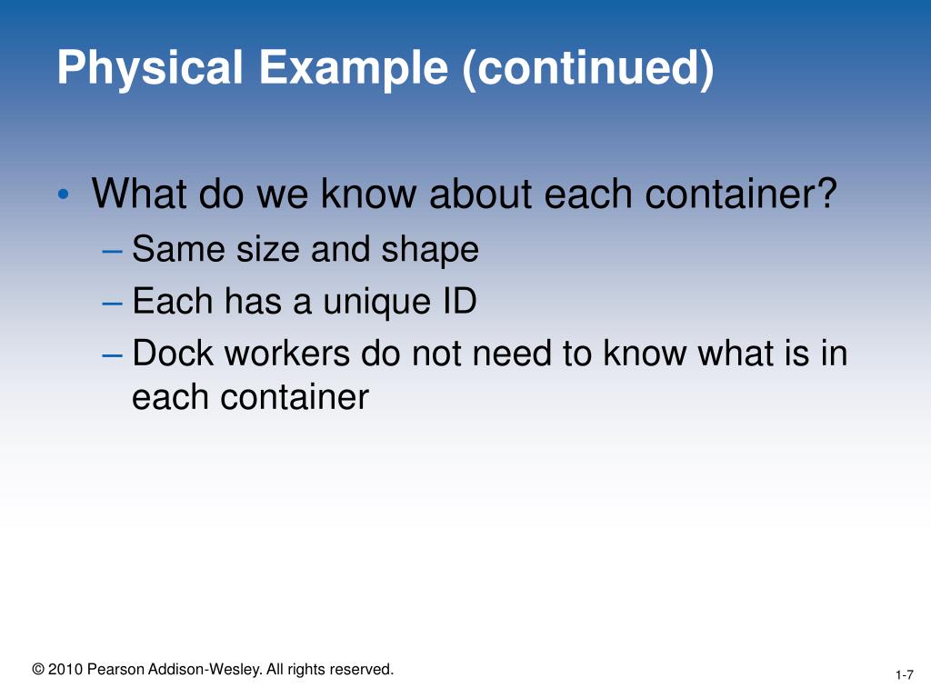 Physical Example (continued) • What do we know about each container? • Same size and shape • Each has a unique ID • Dock workers do not need to know what is in each container