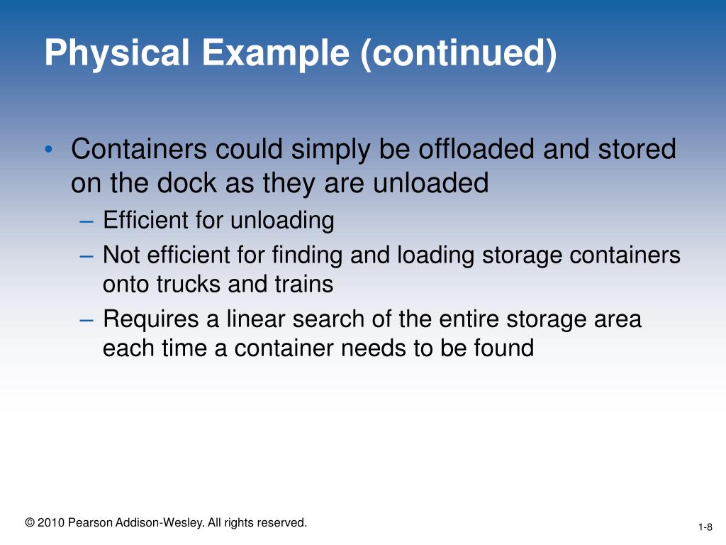 Physical Example (continued) • Containers could simply be offloaded and stored on the dock as they are unloaded • Efficient for unloading • Not efficient for finding and loading storage containers onto trucks and trains • Requires a linear search of the entire storage area each time a container needs to be found