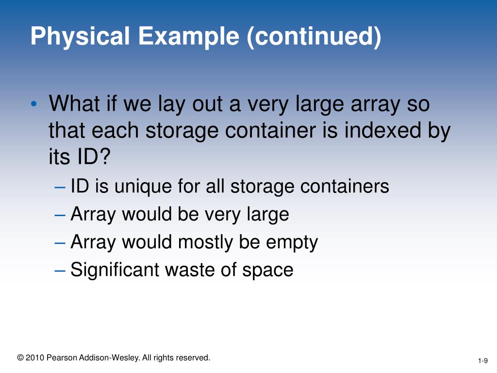 Physical Example (continued) • What if we lay out a very large array so that each storage container is indexed by its ID? • ID is unique for all storage containers • Array would be very large • Array would mostly be empty • Significant waste of space