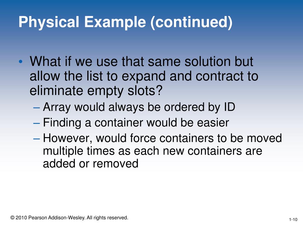 Physical Example (continued) • What if we use that same solution but allow the list to expand and contract to eliminate empty slots? • Array would always be ordered by ID • Finding a container would be easier • However, would force containers to be moved multiple times as each new containers are added or removed