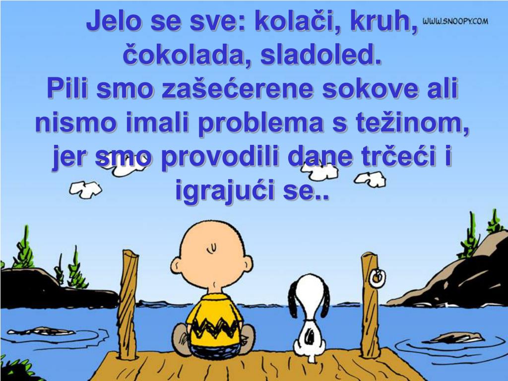Jelo se sve:kolači, kruh, čokolada, sladoled. Pili smozašećerene sokovealinismo imali problema s težinom, jer smoprovodili danetrčećii igrajući se..