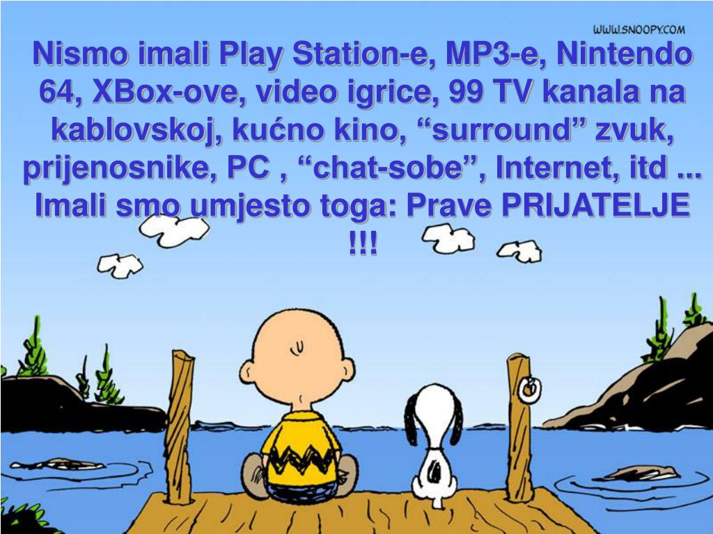 Nismo imali Play Station-e, MP3-e, Nintendo 64, XBox-ove, video igrice, 99 TV kanalanakablovskoj, kućno kino, “surround” zvuk, prijenosnike, PC , “chat-sobe”, Internet, itd ... Imali smo umjesto toga: PravePRIJATELJE !!!