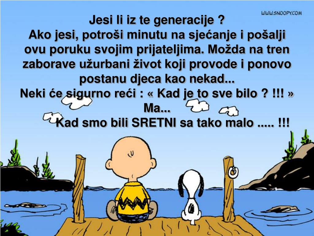 Jesi li iz te generacije ? Ako jesi, potrošiminutuna sjećanje i pošalji ovu poruku svojim prijateljima. Možda na trenzaboraveužurbani životkoji provodeiponovo postanu djeca kao nekad... Neki će sigurno reći :« Kad je to sve bilo ? !!! » Ma... Kad smo biliSRETNI sa tako malo ..... !!!