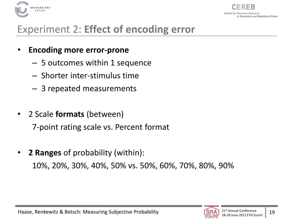 Experiment 2: Effectofencodingerror • Encodingmoreerror-prone • 5 outcomeswithin 1 sequence • Shorter inter-stimulus time • 3 repeatedmeasurements • 2 Scaleformats (between) 7-point ratingscale vs. Percentformat • 2 Rangesofprobability (within): 10%, 20%, 30%, 40%, 50% vs. 50%, 60%, 70%, 80%, 90%