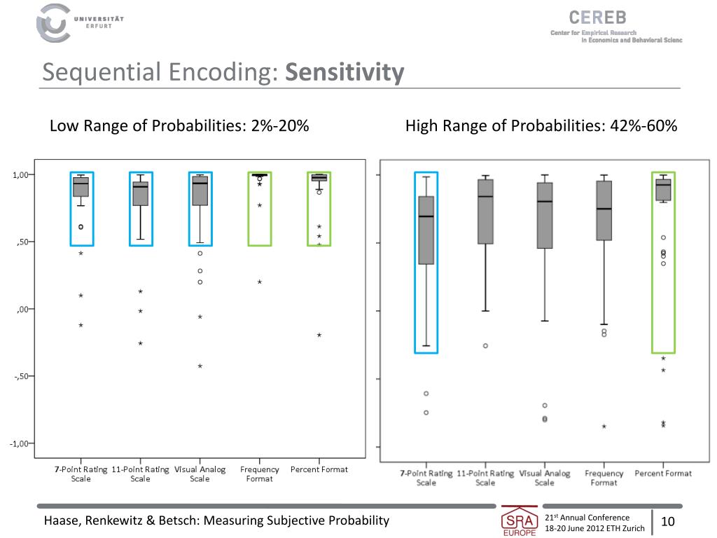 Conclusions & Implications • Different scale formats vary in sensitivity with numeric measures generally faring the best • Sensitivity also varies as a function of error in infomation at the time of judgment • Scale characteristics (e.g. resolution) become less important with increasing error • Context dependency increases with increasing error • In the realm of probabilities rating scales are not suitable for between-subjects research