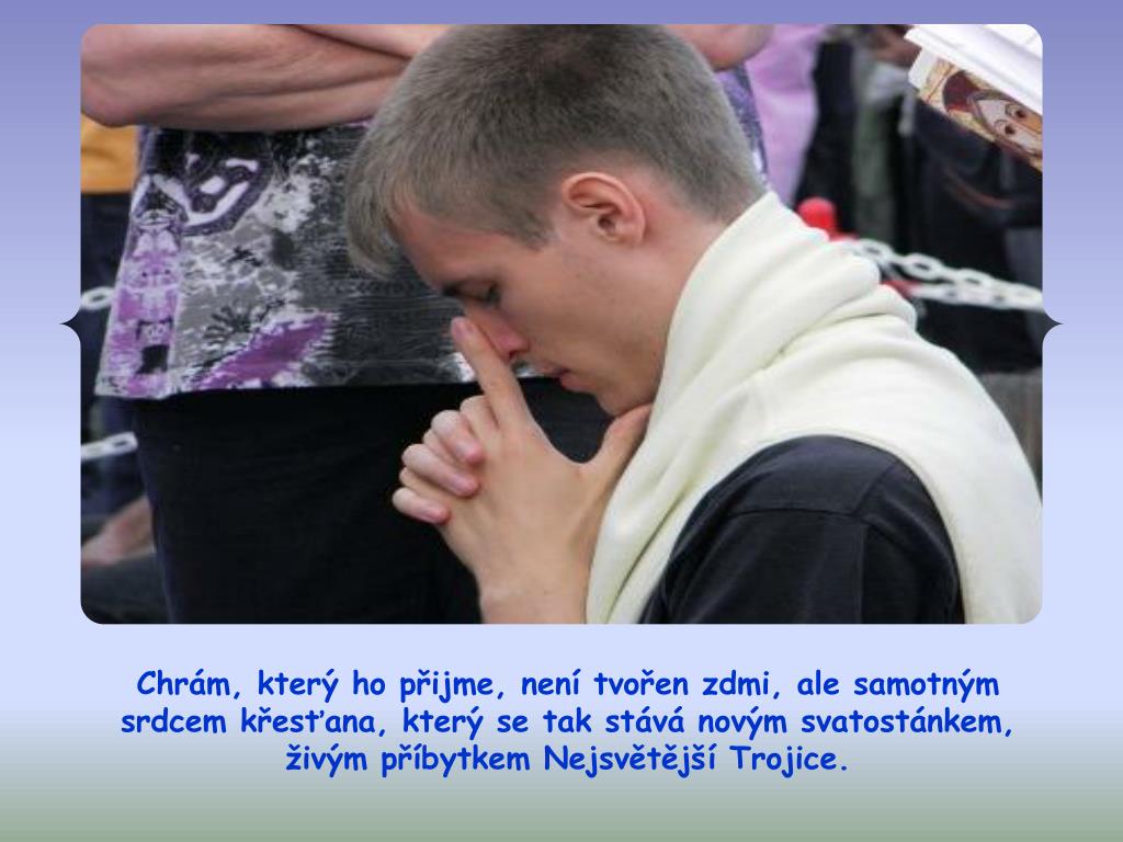 Chrám, který ho přijme, není tvořen zdmi, ale samotným srdcem křesťana, který se tak stává novým svatostánkem, živým příbytkem Nejsvětější Trojice.