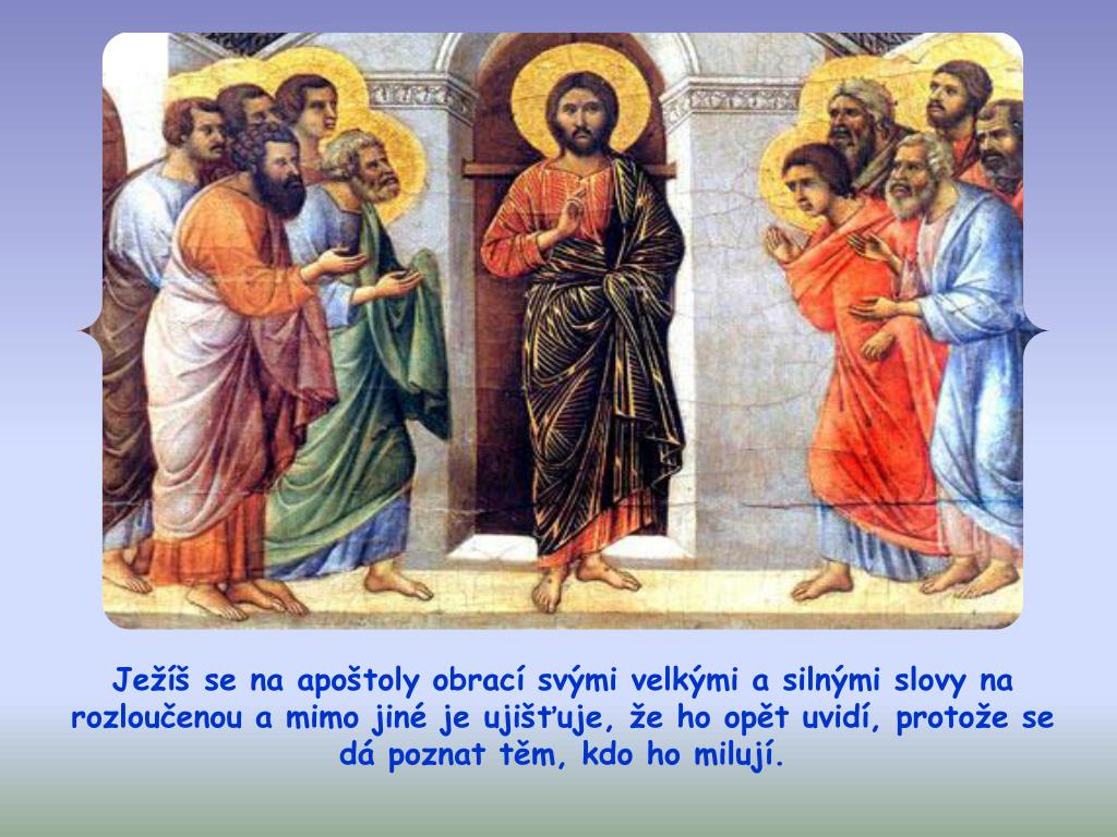 Ježíš se na apoštoly obrací svými velkými a silnými slovy na rozloučenou a mimo jiné je ujišťuje, že ho opět uvidí, protože se dá poznat těm, kdo ho milují.
