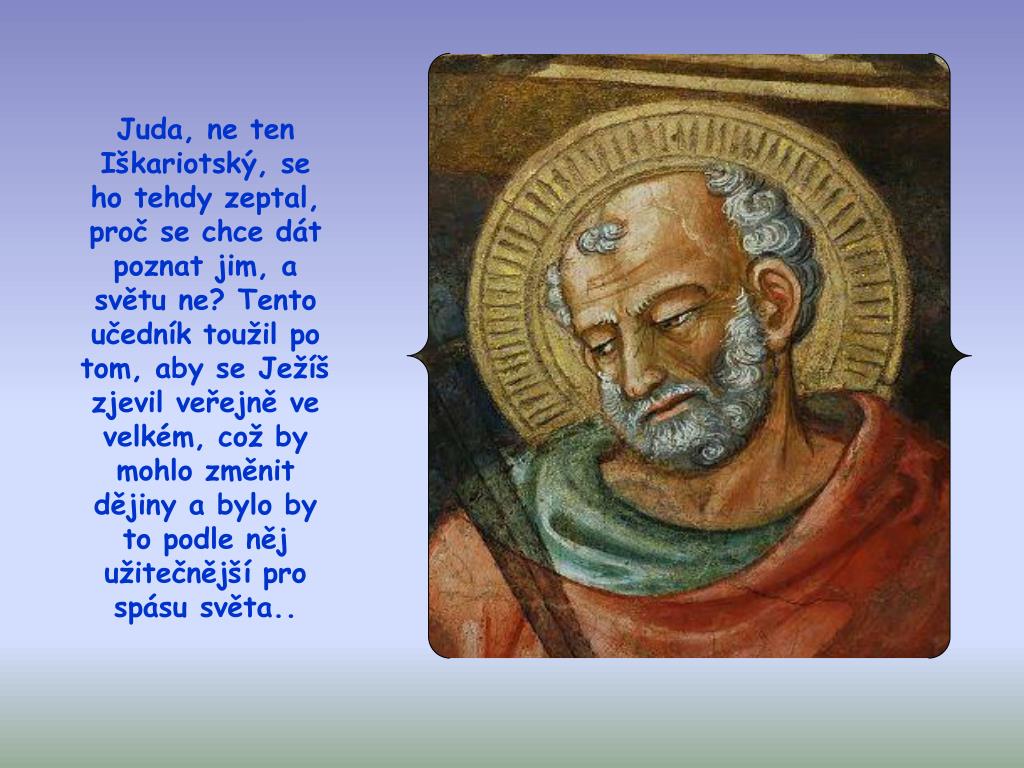 Juda, ne ten Iškariotský, se ho tehdy zeptal, proč se chce dát poznat jim, a světu ne? Tento učedník toužil po tom, aby se Ježíš zjevil veřejně ve velkém, což by mohlo změnit dějiny a bylo by to podle něj užitečnější pro spásu světa..