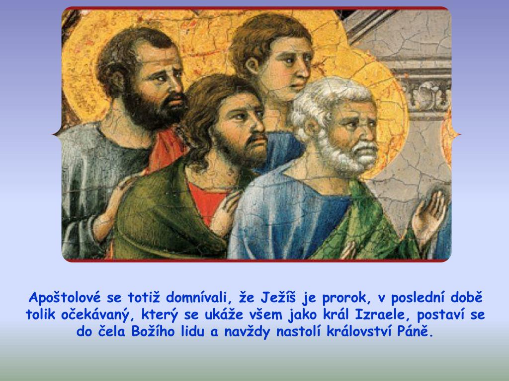 Apoštolové se totiž domnívali, že Ježíš je prorok, v poslední době tolik očekávaný, který se ukáže všem jako král Izraele, postaví se do čela Božího lidu a navždy nastolí království Páně.