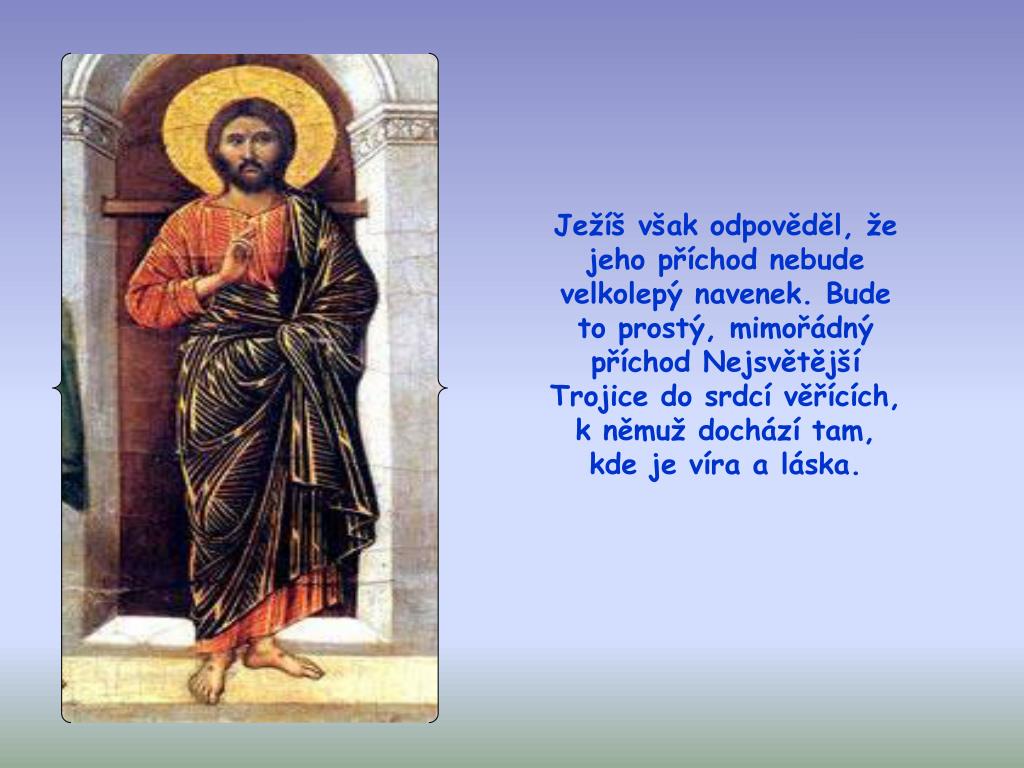 Ježíš však odpověděl, že jeho příchod nebude velkolepý navenek. Bude to prostý, mimořádný příchod Nejsvětější Trojice do srdcí věřících, k němuž dochází tam, kde je víra a láska.