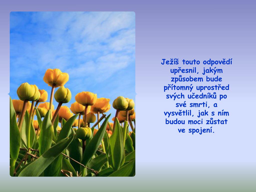 Ježíš touto odpovědí upřesnil, jakým způsobem bude přítomný uprostřed svých učedníků po své smrti, a vysvětlil, jak s ním budou moci zůstat ve spojení.