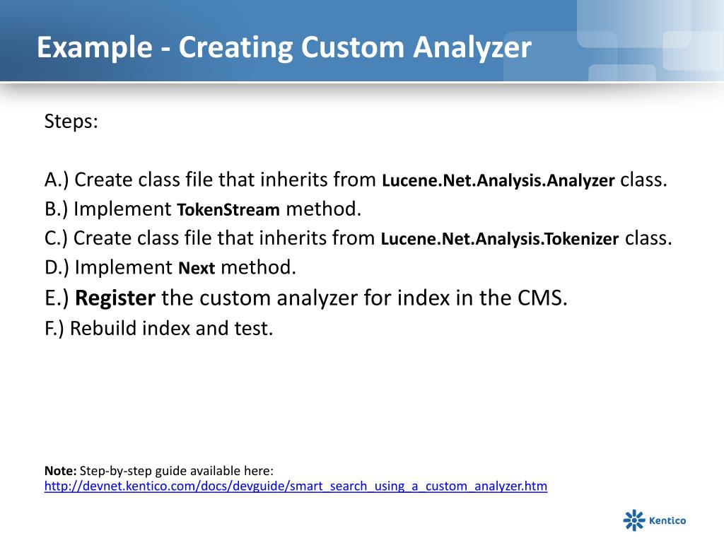 Example - Creating Custom Analyzer Steps: A.) Create class file that inherits from Lucene.Net.Analysis.Analyzerclass. B.) Implement TokenStream method. C.) Create class file that inherits from Lucene.Net.Analysis.Tokenizerclass. D.) Implement Nextmethod. E.) Register the custom analyzer for index in the CMS. F.) Rebuild index and test. Note: Step-by-step guide available here: http://devnet.kentico.com/docs/devguide/smart_search_using_a_custom_analyzer.htm