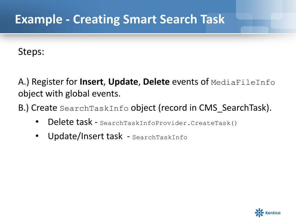 Example - Creating Smart Search Task Steps: A.) Register for Insert, Update, Delete events of MediaFileInfo object with global events. B.) Create SearchTaskInfo object (record in CMS_SearchTask). Delete task - SearchTaskInfoProvider.CreateTask() Update/Insert task - SearchTaskInfo