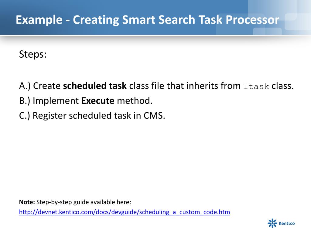 Example - Creating Smart Search Task Processor Steps: A.) Create scheduled task class file that inherits from Itask class. B.) Implement Execute method. C.) Register scheduled task in CMS. Note: Step-by-step guide available here: http://devnet.kentico.com/docs/devguide/scheduling_a_custom_code.htm
